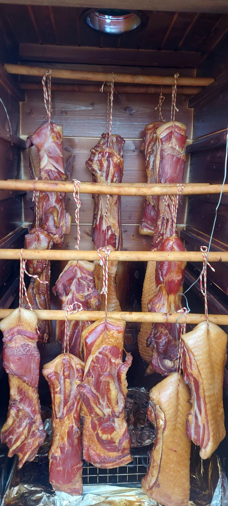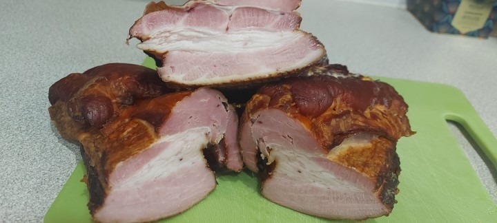 Boczek wędzony i podpiekany na drzewie bukowo-olchowym.